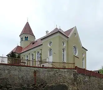 Le bâtiment de style néo-roman offrait environ 180 places. Les offices y ont eu lieu jusqu'en 1938.