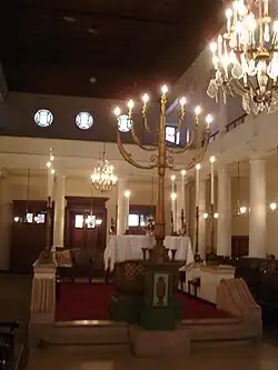 La tevah (bimah pour les Ashkénazes) avec son pupitre en bois peint où officie le rabbin, est située selon le rite séfarade, au centre de la synagogue. Devant se trouve la majestueuse menorah (chandelier à sept branches) en bois doré préservée de l'ancienne synagogue.