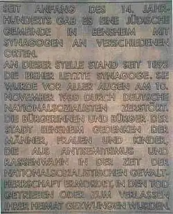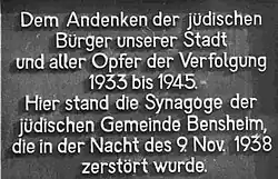 « Depuis le début du XIVe siècle, existait une communauté juive à Bensheim avec des synagogues en différents endroits. À cet emplacement se trouvait depuis 1892 la dernière synagogue. Elle a été détruite le par les nationaux-socialistes allemands à la vue de tout le monde. Les citoyennes et citoyens de la ville de Bensheim se souviennent des hommes, femmes et enfants qui ont été assassinés ou qui ont été contraints d'abandonner leur maison en raison de la tyrannie nationale-socialiste. »