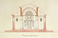 À l'intérieur, sur les deux côtés, trois piliers rectangulaires aux angles arrondis, soutiennent la galerie des femmes. La distance de l'entrée, sans compter le petit vestibule, jusqu'à la grande niche pour l'Arche Sainte, est de 90 pieds, en tout 115 pieds. Les décorations du plafond ne sont pas encore terminées. Les aménagements intérieurs de l'espace, l'emplacement de la chaire, des bancs, etc. font l'objet de discussions entre l'architecte, les anciens de la communauté, le Dr Roman, rabbin du Land et M.. Le Dr Pinhas[3];… »