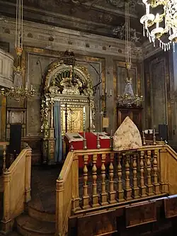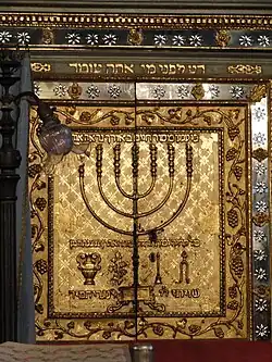 La Teva, à laquelle on accède en montant deux marches, est entourée d'une balustrade en bois. Elle se trouve située juste devant l'Arche Sainte, de style baroque vénitien du XVIIIe siècle, dont les portes en bois peintes à l'or et finement sculptées, représentent en haut une grande Menorah (chandelier à sept branches) et en bas des instruments sacrificiels, la verge d'Aaron, la branche d'olivier et le pot de manne.