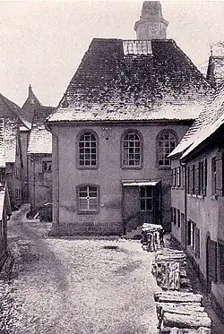 Au XVIIe siècle, des salles de prière existent dans des maisons juives privées. Une d'elles, se trouve dans une maison située sur les remparts de la ville et appartient au Juif Gabriel, arrivé à Crailsheim en 1596. En 1604, Gabriel est menacé d'expulsion après qu'on eut appris qu'il célébrait secrètement des services religieux dans sa maison et qu'il invitait de nombreux Juifs du quartier. Pendant la guerre de Trente Ans (1618-1648), la maison de Gabriel est vendue à un chrétien, mais est rachetée par un Juif après la guerre. Depuis environ 1635, des offices religieux ont lieu aussi dans la maison d'Elias, au centre-ville, non loin de la chapelle Notre-Dame sur la place du marché (à l'extrémité sud de l'actuelle Karlsplatz). En 1664, Elias commence à construire une annexe à sa maison sans en informer le conseil municipal ni obtenir d'autorisation. La rumeur court qu'une synagogue doit être construite dans cette annexe. La ville ordonne alors à la communauté juive de se contenter pour ses offices de l'ancienne maison de Gabriel sur les remparts de la ville, mais cela n'a probablement pas été mis en œuvre. En 1671, Elias meurt; Son fils Gabriel reçoit la maison en héritage, mais décède en 1683. La maison, dans laquelle se trouve encore la salle de prière, devient la propriété de la communauté juive. Celle-ci la fait démolir en 1695 afin de pouvoir construire une synagogue sur son emplacement. Cependant, la communauté juive doit lutter pendant trois ans, sans succès, pour obtenir l'autorisation de construire une synagogue. La construction n'ayant pas été approuvée, la communauté décide d'installer sans autorisation une salle de prière au troisième étage de la maison d'Abraham Braunsbacher. Il s’agit de la maison qui dépassait les remparts de la ville et qui abritait déjà la première salle de prière. Sur le plan de la ville de Horland[3] de 1738, elle porte le numéro 138. Elle se trouve sur la Ringgasse qui part de la Ziegelgasse. Finalement, en 1698, l'installation est approuvée par la ville. La salle de prière va servir de 1698 à 1783 et sera mentionnée comme synagogue. Un Hazzan (chantre) est désormais employé pour conduire les offices. Il fait aussi fonction de Shamash (bedeau) et de shohet (abatteur rituel). Après la construction de la synagogue en 1783, la salle de prière a été probablement vendue. Le bâtiment sera détruit pendant la guerre en 1945.