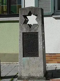 Depuis , une stèle en calcaire blanc dans la Adam-Weiß-Strasse rappelle l'ancienne synagogue qui se trouvait ici et qui fut profanée par des hommes de la SA en 1938, puis victime de la guerre aérienne en 1945[10]. Sur la plaque commémorative est inscrit en allemand: