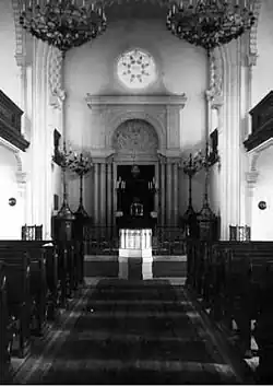 On ne possède malheureusement qu'une seule photographie de l'intérieur de la synagogue, mais celle-ci permet d'observer la magnificence de la salle de prière principale, sa hauteur, les galeries avec les balustrades en bois, l'Arche Sainte, la Bimah, la rosace et même d'avoir une vue sur les magnifiques chandeliers.
