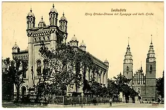 En 1864, l'augmentation du nombre de fidèles oblige le conseil de la communauté à construire une synagogue. Celle-ci est construite selon les plans de l'architecte Knoebel dans la König Ottokar Straße (actuellement rue Kochanowski) et est inspirée de la synagogue du quartier Leopoldstadt de Vienne. Les menuiseries sont réalisées par le maitre-charpentier Jungfer, et l'orgue réalisé par le facteur Haas. Les autorités municipales fournissent gracieusement le bois de construction. À l'époque, c'est le plus grand bâtiment de la ville. Il est situé dans l'ancien secteur de défense, en dehors des murs de la ville, dans une banlieue nouvellement créée à l'ouest de la ville. C'est un secteur où se trouve la plupart des édifices publics, le palais de justice, la prison, la poste centrale, un monastère, un foyer pour les pauvres, etc. À côté de la synagogue se trouve l'église catholique de la Sainte-Vierge-Marie, ainsi qu'une église protestante, dans ce qu'on appelle alors une composition urbaine œcuménique.