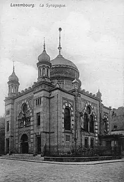 En 1894 la grande synagogue est construite à l'angle des rues Notre-Dame et Aldringen[3]. Les plans ont été conçus par l'architecte allemand Ludwig Levy et Charles Arendt a dirigé sa construction. La synagogue a été construite dans le style mauresque de la synagogue de Florence. Elle comptait 300 places, dont 150 pour les hommes, 120 pour les femmes et 30 pour la chorale et les écoliers. Elle est inaugurée le par le grand rabbin Isaac Blumenstein en présence de membres du gouvernement et du conseil communal[4]. En , elle est profanée par la Gestapo et est démolie progressivement jusqu'en 1943, car il devint difficile de trouver une entreprise disposée à entreprendre ce travail[5],[4].