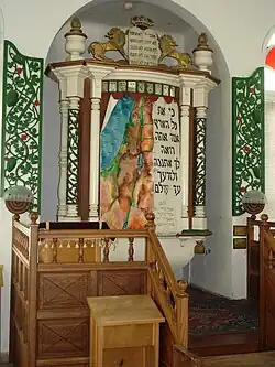 À l'ouest, quatre colonnes supportent une galerie au-dessus de la porte d'entrée. À l'est, entre les deux fenêtres, dans un léger renfoncement, est située l'Arche Sainte, récupérée de l'ancienne synagogue détruite. Le reste du mobilier de l'ancienne synagogue, comme la Bimah et les sièges se trouvent actuellement au musée. Tout ce mobilier en bois finement sculpté, a été réalisé par un des membres fondateurs du moshav, Aaron Zelig Levita. Sur la partie supérieure de l'Arche Sainte, soutenue de chaque côté par trois colonnettes de style différent, se trouvent deux lions de Juda peints en or, tenant les Tables de la Loi surmontées d'une couronne, mais regardant en sens opposé. Aux extrémités, deux pots à feu blancs avec leur flamme dorée.