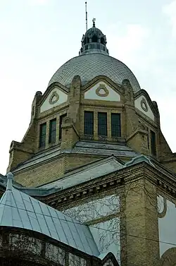 Les façades extérieures de la synagogue, à l'exception de la façade orientale, sont dotées d'un porche surmonté d'une rosace avec des vitraux ; l'édifice comporte en tout neuf portes d'entrée[2],[4],[3]. Certaines surfaces des façades sont recouvertes de briques jaunes, d'autres sont recouvertes d'un enduit peint ; les portails et les fenêtres sont encadrés de briques[2]. La façade occidentale est flanquée de deux tours symétriques hautes de 27 m surmontées de deux dômes plus modestes que le dôme central. Elle est dotée de deux portails latéraux et d'un porche central, le plus imposant de l'édifice, surmonté d'un pignon et incorporé dans une arcade monumentale qui englobe également une rosace. La partie orientale de l'édifice se caractérise par une abside centrale proéminente et deux absides latérales plus petites. La façade occidentale et les murs méridionaux et septentrionaux sont décorés de deux Tables de la Loi avec des inscriptions en hébreu ; ces éléments constituent les seuls motifs typiquement juifs visibles à l'extérieur de l'édifice[2],[4],[3].