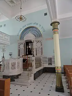 Les bancs en bois pour les offices sont orientés vers le mur où se trouve l'Arche Sainte. À l'arrière de la salle, les bancs sont disposés autour de tables pour servir de lieu d'étude des textes sacrés. On accède à l'estrade en marbre blanc où se situe l'Arche Sainte, dirigée vers Jérusalem, par deux petits escaliers de quatre marches, situés de part et d'autre de la chaire toute blanche et ajourée d'un décor de fleur.