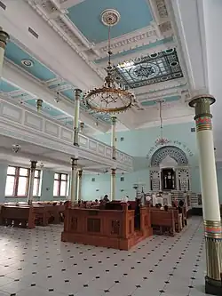 La salle de prière est peinte en blanc et bleu, avec le sol dallé de carreaux gris. La galerie réservée aux femmes court sur trois des côtés de la pièce de façon asymétrique. Le côté rue plus étroit est soutenu par une rangée de colonnes de style égyptien identiques à celles du vestibule, tandis que le côté opposé, plus large est soutenu par deux rangées de colonnes identiques.
