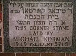 - This corner stone laid by Michael Korman 1949 président 5710