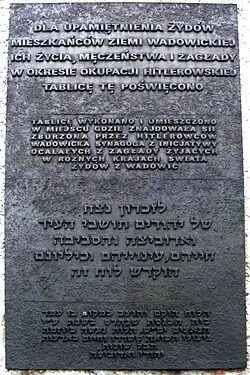 « Cette plaque commémore les habitants juifs de la région de Wadowice, leur vie, leur martyre et leur extermination pendant l'occupation nazie. La plaque a été réalisée et placée à l’endroit où se trouvait la synagogue de Wadowice détruite par les nazis, à l'initiative des Juifs de Wadowice qui ont survécu à la Shoah et qui vivent dans différents pays du monde. »