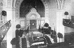 Les hommes s'assoient au rez-de-chaussée sur des bancs qui font face à l'Arche Sainte. Celle-ci est située au centre du mur est et est encadrée de chaque côté par d'imposantes colonnes doubles avec des chapiteaux carrés ornés, supportant un fronton triangulaire couronné des Tables de la Loi. La porte du sanctuaire, où sont précieusement conservés les rouleaux de Torah, est en bois de chêne massif, et est cachée par un Parokhet (rideau) en velours brodé d'or. Le rideau est changé selon les fêtes. Il est blanc pour les Yamim Noraïm (les jours redoutables: Roch Hachana et Yom Kippour); bleu pour les Shalosh regalim (les trois fêtes de pèlerinage: Pessa'h; Chavouot, Souccot); lie de vin ou vert foncé pour les Chabbat. À gauche de l'Arche, se trouve une Hanoukkia (chandelier à neuf branches, utilisé pour la fête de Hanoucca). On accède à l'Arche Sainte en montant cinq marches situées à droite et à gauche de la Bimah.