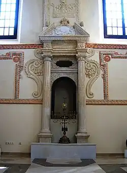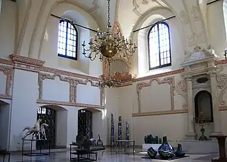 Le bâtiment principal a un haut attique au-dessus. À l'intérieur, la grande salle est caractérisée par un haut plafond voûté et de nombreux stucs. L'arche sainte de la Torah dans la synagogue date de la première moitié du XVIIe siècle et donc de l'époque de la construction du bâtiment [2].
