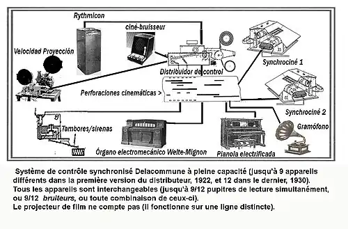 - Peu après, en 1922-1923, le synchro-ciné commence déjà à se convertir en un système complet de synchronisation, dans lequel le pupitre de lecture n’est plus qu’un des nombreux éléments autour d'un autre dispositif central, la bande de contrôle, qui peut déclencher automatiquement divers dispositifs bruiteurs (Ciné-bruiteurs) ou fabricants de bruits (aussi incorporés au système), allumer des pianolas, des gramophones et divers pupitres, jusqu'à un maximum de 9 dispositifs, puis 12 (1930). La preuve du changement d'orientation des machines et des objectifs finaux est le fait que, bien que les pupitres de lecture continuent de faire partie du système, il était déjà parfaitement possible réaliser une performance sans en utiliser du tout (en utilisant uniquement le distributeur central, et les appareils bruiteurs reliés). Ils font aussi partie du système contenant les diverses procédures et méthodes enregistrées pour améliorer et faciliter l'usage de sa procédure.