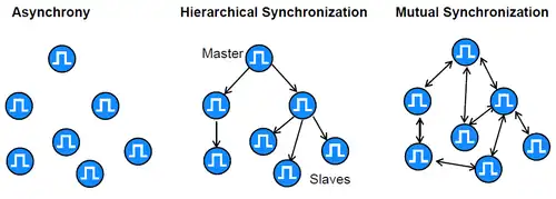- Inter-nœud, où le signal de synchronisation est envoyé à un autre nœud par une connexion spécialement assignée à cette tâche, ou par un signal PHY.