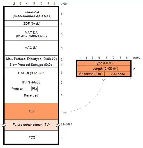 Le protocole ESMC est composé de l'entête standard d'Ethernet, d'un entête spécifique définie par l'UIT, d'un emplacement pour des paramètres et d'une structure de Type Length Value (TLV)[5].
