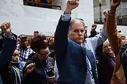 Bien que beaucoup plus petits par rapport à leur pic d’adhésion dans les années , les syndicats américains restent un facteur politique, tant par la mobilisation de leurs propres membres que par des coalition politiques avec des organisations militantes partageant les mêmes idées sur des questions telles que les droits des immigrants, la protection de l’environnement, la politique commerciale, les soins de santé et les campagnes pour un salaire décent[8]. Une préoccupation particulière concerne les efforts des villes et des États pour réduire les obligations de pension dues aux travailleurs syndiqués qui prendront leur retraite à l’avenir[9]. Une étude des élections américaines de à a révélé que les syndicats augmentent la participation électorale tant des membres que des non-membres[10]. Les syndicats ont une alliance de longue date avec le Parti démocrate, et les membres des syndicats constituent une partie importante de la base électorale du parti[11]. En revanche, le Parti républicain s’est opposé aux syndicats et a défendu diverses politiques antisyndicales, telles que l’adoption de lois sur le droit au travail, des restrictions sur la négociation collective des syndicats du secteur public, l’abrogation des lois sur le salaire prévalent, et la préemption[Quoi ?] des lois locales sur le salaire minimum[12].