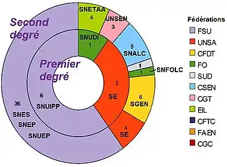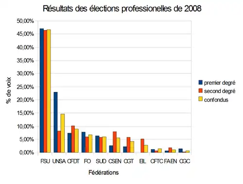 - Le syndicalisme enseignant est dominé par la FSU. Cette fédération est très largement première chez les enseignants (47 % aux élections de 2005) mais connaît d'importants débats internes entre ses tendances et ses différents syndicats (principalement SNES et SNUipp).
