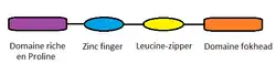 le domaine riche en proline et le domaine en doigt de zinc interagissent avec d'autres facteurs de transcriptions (NFAT,...). Le domaine en glissière à leucine permet l'homo- ou l'hétérodimérisation. Le domaine forkhead se lie à l'ADN ce qui déclenche des signaux de localisation intra-nucléaire.