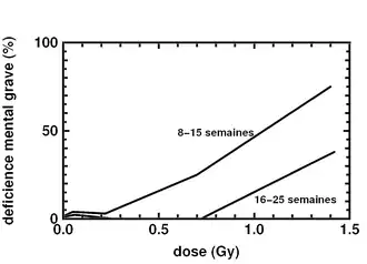 Les fœtus sont particulièrement radiosensibles ; les risques liés sont la fausse couche ainsi que la tératogenèse : microcéphalie, retard mental, malformation, retard de croissance. Ces effets ont été étudiés chez les hibakusha. Une exposition à 1,4 Gy — dose provoquant un syndrome léger chez l'adulte — d'un embryon de 8 à 15 semaines provoque 75 ± 20 % (intervalle de confiance : 90 %) de déficience mentale grave par la suite ; cette proportion tombe à 37 ± 15 % pour un fœtus âgé de 16 à 25 semaines[15]. Aucun effet notable n'est observé sur le quotient intellectuel pour un âge gestationnel de plus de 26 semaines ou de moins de 8, ainsi que pour des doses inférieures à 0,1 Gy ; pour une dose de 0,1 à 0,5 Gy, la déficience moyenne, tous âges confondus, est de 8 ± 6 (intervalle de confiance : 95 %) points de QI[16]. Le retard de croissance est observé chez les sujets exposés à plus de 1 Gy, il est de l'ordre de 10 cm[16].