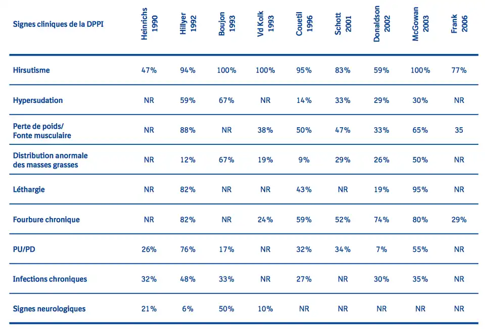 Les chevaux atteints de DPIP présentent une large variété de signes cliniques non spécifiques qui progressent avec le temps. Ces signes incluent : hirsutisme, fourbure, hypersudation, léthargie, fonte musculaire, distribution anormale des masses grasses et polyurie/polydipsie. Les signes moins souvent décrits de la DPIP sont : retard de cicatrisation, immunosuppression et sensibilité aux infections (sinusite, par ex.), lactation persistante et infertilité. Certains de ces signes peuvent être associés à tort au processus normal de vieillissement, ceux-ci apparaissant souvent de manière insidieuse. Aucun consensus n’existe actuellement sur le tableau clinique de la DPIP. Le tableau ci-dessous résume les observations décrites dans différentes publications.