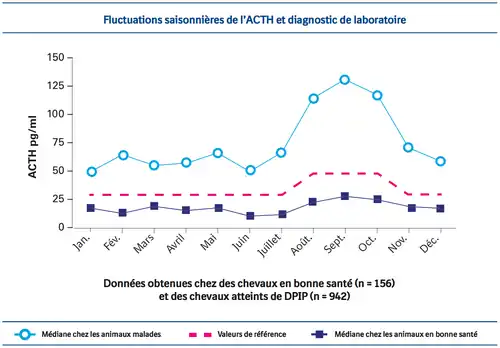 Bien que le syndrome de Cushing ait été identifiée pour la première fois en 1932 chez le cheval âgé, sa physiopathologie n’a été élucidée qu’au cours de ces 25 dernières années3. En 1988, Millington et al. ont observé chez les chevaux atteints une baisse des concentrations de dopamine dans les tissus hypophysaires, ce qui a permis de comprendre la physiopathologie de cette maladie[33]. En 2008, Haritou et al. ont décrit des variations saisonnières de la dopaminémie chez les chevaux sains, les taux étant toutefois bien plus faibles chez les chevaux souffrant de DPIP[34]. Les chevaux atteints de DPIP présentaient des concentrations de dopamine 88 % plus faibles que celles de leurs témoins du même âge[33].