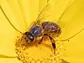 Certaines fleurs pollinisées par les abeilles ont tendance à être de couleur jaune ou bleue, souvent avec guides à nectar ultraviolets et du parfum. Le nectar, le pollen, ou les deux à la fois, sont offerts comme récompenses en quantité variable. Le sucre dans le nectar a tendance à être composé en majorité de saccharose[16]. Certaines plantes ne peuvent être pollinisées que par des abeilles parce que leur anthères libèrent le pollen à l'intérieur, et elles doivent être secouées par pollinisation vibratile (ou « sonication »). Les abeilles en général sont les seuls insectes qui ont ce comportement. Les bourdons peuvent assurer la sonication, mais les abeilles à miel ne le font pas.