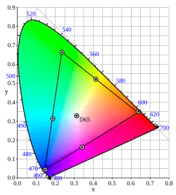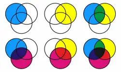 - ↑ Les ouvrages didactiques recommandent d'éviter de parler de couleurs primaires pour les colorants de la synthèse soustractive pour éviter la confusion avec celles qui se trouvent aux angles de leur gamut sur le diagramme de chromaticité (Sève 2009, p. 199-201).