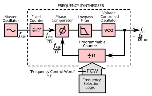 Une boucle à verrouillage de phase est un système de contrôle à rétroaction. Elle compare les phases de deux signaux d'entrée et produit un signal d'erreur proportionnel à la différence entre leurs phases. Le signal d'erreur est ensuite filtré par un filtre passe-bas et utilisé pour piloter un oscillateur commandé en tension (VCO) qui crée une fréquence de sortie. La fréquence de sortie est renvoyée à l'entrée du système par l'intermédiaire d'un diviseur de fréquence, ce qui produit une boucle de rétroaction négative. Si la fréquence de sortie dérive, le signal d'erreur de phase augmentera, entraînant la fréquence dans la direction opposée afin de réduire l'erreur. La sortie est ainsi "verrouillée" sur la fréquence de l'autre entrée. Cette autre entrée est appelée "référence" et provient généralement d'un oscillateur à quartz, dont la fréquence est très stable. Le schéma fonctionnel ci-dessous montre les éléments de base et la disposition d'un synthétiseur de fréquence basé sur une boucle à verrouillage de phase.