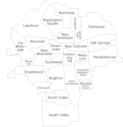 Syracuse est composée de plusieurs quartiers, comme la plupart des cités américaines : quartier d'affaires, le bourg (le centre) et les villas et maisons autour.