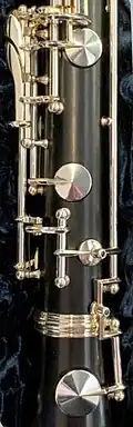 dans le bas du registre clairon) sont équipées de rouleaux à l'intérieur (comme sur les clarinettes Oehler). - 4. La clé de registre a généralement la même forme que sur les clarinettes allemandes, c'est-à-dire que le trou d'harmonie correspondant ne se trouve pas sur la face inférieure de la clarinette mais sur le côté gauche, ce qui nécessite une clé de forme montante au lieu d'une clé droite ; celle-ci peut être combinée avec une clé supplémentaire à ouverture et fermeture automatique pour améliorer la sonorité du si