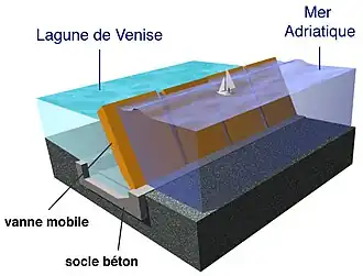 Le système MOSE, acronyme de MOdulo Sperimentale Elettromeccanico (« module expérimental électromécanique »), est un système intégré de défense formé d'une rangée de parois mobiles escamotables permettant d’isoler la lagune de Venise de la mer Adriatique durant les phénomènes de hautes marées dépassant un niveau établi (110 cm) et jusqu’à un niveau maximum de 3 mètres. Cet ouvrage, conçu par l'ingénieur Alberto Scotti[2] du cabinet d'ingénierie Technital[3] de Vérone, est lié à d’autres interventions complémentaires comme la consolidation du littoral, la surélévation des rives et des pavages et la requalification environnementale de la lagune, devrait permettre de défendre Venise contre les phénomènes extrêmes comme les inondations (acqua alta) et éviter sa dégradation morphologique, qui provoque l’envahissement progressif de la lagune par la mer et l’affaissement du sol.