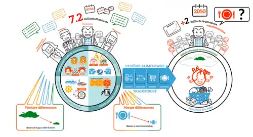 - ↑ Le diagramme montre quatre limites du système alimentaire conventionnel au début du XXIe siècle : une personne sur trois dans le monde souffre d'au moins une forme de malnutrition (828 millions de personnes souffrent de la faim en 2021[1], 2 milliards ont un accès insuffisant aux vitamines et minéraux[2], 1,9 milliard d'adultes sont en surpoids (en) dont 650 millions sont obèses)[3] ; nourriture trop riche en matières grasses, sucre, sel et viande, contribuant à la diffusion des maladies cardiovasculaires, l'augmentation des gaz à effet de serre et à la standardisation des denrées (75 % de l'ensemble de la production mondiale alimentaire repose sur 12 espèces végétales et 5 espèces animales)[4] ; un tiers de la nourriture est gaspillée ; surexploitation des ressources naturelles (de l'eau, des poissons, des sols dont 40 % sont dégradés[5]…) qui contribue à l'érosion de la biodiversité, épandage massif d'intrants et d'effluents d'élevage qui contribue à la pollution des sols et de l'eau avec pour conséquence l'eutrophisation des milieux (celle-ci induit la prolifération de châtaignes et fougères et lentilles d'eau ainsi que d'algues), des effets toxiques à plus ou moins long terme, des maladies ou des perturbations endocriniennes.