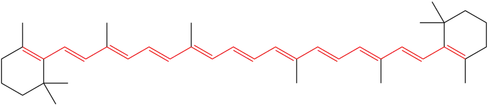 Les systèmes conjugués possèdent des propriétés uniques qui donnent des couleurs intenses. De nombreux pigments utilisent des systèmes d'électrons conjugués, comme la longue chaîne d'hydrocarbure conjuguée du β-carotène, donnant une couleur fortement orangée. Quand un électron du système absorbe un photon de lumière de la bonne longueur d'onde, il peut être porté à un niveau d'énergie plus élevé (voir particule dans une boîte). La majorité de ces transitions électroniques se font d'un électron d'une orbitale pi vers une orbitale pi antiliante (π vers π*), un électron non liant peut aussi être déplacé (n vers π*). Les systèmes conjugués de moins de huit doubles liaisons conjuguées absorbent uniquement dans les ultraviolets et apparaissent incolores à l'œil humain. À chaque double liaison ajoutée, le système absorbe des photons de plus grande longueur d'onde (et donc de plus basse énergie), et la couleur du composé s'étend du bleu au jaune. Les composés orange ou rouges ne s'appuient typiquement pas que sur les seules doubles liaisons.