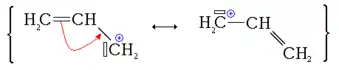 - Conjugaison de type π-σ-v : il s'agit de la suite liaison double/liaison simple/atome portant une lacune électronique (chargé ou non). C'est le cas par exemple des cations d'allyle