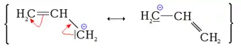 - Conjugaison de type π-σ-n : il s'agit de la suite liaison double/liaison simple/atome porteur d'un doublet libre (chargé ou non). C'est notamment le cas des anions d'allyle, ou des alcènes halogénés.
