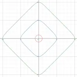 Tous les points de H, et même la plupart des points à l'infini, ont des coordonnées axiales, mais un couple de nombres (x,y) ne correspond à un point de H que si ; si , le couple correspond à un point à l'infini, et les couples tels que ne correspondent à rien. Ainsi, le système des coordonnées axiales définit une injection de H vers le plan , dont l'image (l'ensemble des points (x,y) tels que ) est une région ressemblant à une astroïde, représentée en rouge ci-contre.