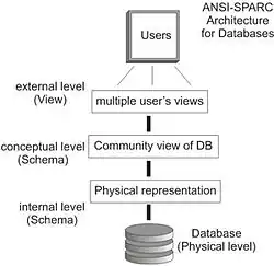 Dans un dispositif de base de données - qui comporte un logiciel applicatif, un SGBD et une base de données - la manière dont les informations sont présentées aux utilisateurs diffère de la manière dont sont organisées les informations, et celle-ci diffère de la manière dont les informations sont enregistrées dans des fichiers. Cette construction à 3 points de vue est basée sur le modèle de référence ANSI/SPARC[1],[5].