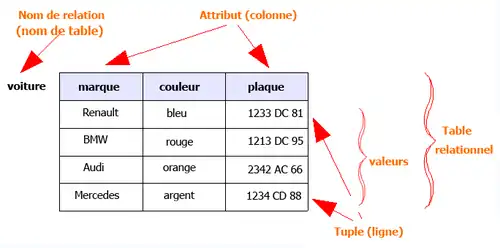 • relationnel : selon ce modèle, les données sont placées dans des tables avec lignes et colonnes et n'importe quelle donnée contenue dans la base de données peut être retrouvée à l'aide du nom de la table, du nom de la colonne et de la clé primaire. Le modèle relationnel est destiné à assurer l'indépendance des données et à offrir les moyens de contrôler la cohérence et d'éviter la redondance. Il permet de manipuler les données comme des ensembles en effectuant des opérations de la théorie des ensembles. Les règles de cohérence qui s'appliquent aux bases de données relationnelles sont l'absence de redondance ou de nul des clés primaires, et l'intégrité référentielle[10]. En 2010, la majorité des SGBD sont de type relationnel : ils manipulent des bases de données conformément au modèle de données relationnel[10] ;