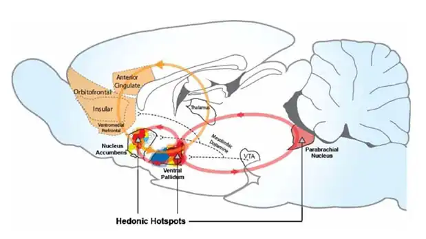 1. la composante affective des renforcements dépend d'un nombre limité de petites structures, appelées « hotspots » ou « points chauds », d'un volume d'environ 1 cm3, et localisées dans le noyau parabrachial, le noyau accumbens et le pallidum ventral[9],[10]. Ces trois structures ou « hotspots » sont interconnectées entre elles et intégrées dans le système des « récompenses / renforcements »[8] (voir figure ci-dessous) ;