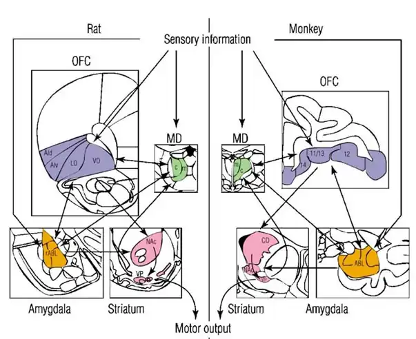 Légende : Amygdala = Amygdale (en orange) ; Ald = Insula agranulaire dorsale ; Alv = Insula agranulaire ventrale ; c = Central ; CD = Caudal ; LO = Orbital latéral ; m = Médial ; MD = Thalamus médiodorsal (en vert) ; Motor output = Sorties motrices ; Nac = Cœur du noyau accumbens ; OFC = Cortex frontal orbital (en violet) ; rABL = Amygdale basolatérale rostrale ; Sensory information = Entrée des informations sensorielles ; Striatum = Striatum (en rose) ; VO = Orbital ventral ; VP = Pallidum ventral.