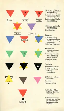 Les badges des camps de concentration nazis font partie du système d'identification dans les camps allemands. Ils sont utilisés dans les camps de concentration par le régime nazi pour identifier la raison pour laquelle les prisonniers y sont emprisonnés[1]. Les triangles sont en tissu et cousus sur les vestes et les pantalons des prisonniers. Ces insignes de la honte obligatoires avaient des significations spécifiques indiquées par leur couleur et leur forme. Ces emblèmes aidaient les gardiens à assigner des tâches aux détenus. Par exemple, un garde pouvait voir en un coup d'œil si quelqu'un était un criminel condamné (insigne vert) et donc probablement d'un tempérament dur adapté à la fonction de kapo.