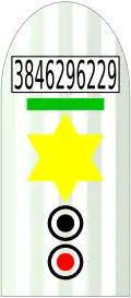 Les marques étaient portées par ordre décroissant comme suit : numéro de détenu, barrette de répétition, triangle ou étoile, membre du bataillon pénitentiaire, suspect d'évasion. Dans cet exemple, le détenu est un condamné juif aux multiples condamnations, servant dans une Strafkompanie et qui est soupçonné d'avoir tenté de s'évader. | |||||