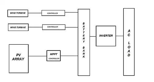 Un système d'alimentation hybride éolien-diesel, comme son nom l'indique, combine des générateurs diesel et des éoliennes[40], et prend généralement sa place dans un réseau local formé de stockage d'énergie, de convertisseurs de puissance et divers composants de contrôle, pour générer de l'électricité. Un tel système est conçu pour augmenter la capacité et réduire les coûts et l'impact environnemental de la production d'électricité dans les communautés éloignées et les installations qui ne sont pas reliées à un réseau électrique[40]. Les systèmes hybrides éolien-diesel réduisent la dépendance au carburant diesel, qui crée de la pollution et coûte cher à transporter[40].