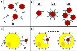 - À l'intérieur de la cellule, la particule phagocytée se trouve dans un endosome, qui fusionne ensuite avec le lysosome pour former le phagosome[39]. Le lysosome contient des enzymes et des acides permettant de tuer et de digérer la particule.