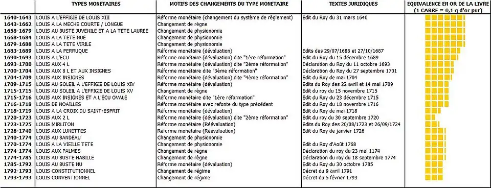 louis 60 sous[réf. nécessaire] 1640 1795 or 11 ½ 230 2 760