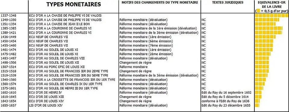 Ainsi, pour un même type monétaire (écu, liard, louis,…), il existe plusieurs pièces différentes. Un écu, par exemple, vaudra toujours trois livres, mais il se frappe en or au XIIIe siècle et en argent (écu blanc) au XVIe siècle. De même, au XVIIIe siècle, l'écu en argent se décline en plusieurs pièces :