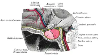 Plusieurs veines portes hypophysaires (venae portales hypophysiales) partent du réseau capillaire de l'hypothalamus, situé au niveau de l'éminence médiane, et relié à l'artère hypophysaire supérieure. Elles constituent le rete mirabile (du latin rete, « réseau », et mirabile, « merveilleux »), placé sur toute la longueur de l'infundibulum. Elles alimentent le réseau capillaire de l'adénohypophyse. C'est un des rares systèmes porte dans l'organisme, c'est-à-dire qui mette en jeu deux réseaux capillaires connectés en série par des veinules. L'antéhypophyse n'est irriguée que par le système porte[1].