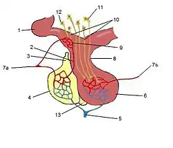 En brun, l'posthypophyse ; 9: système porte.